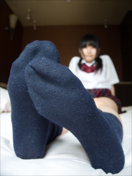 写真は、私服で素足、クラッシュ、XXで紺ソックス、素足、足拓。